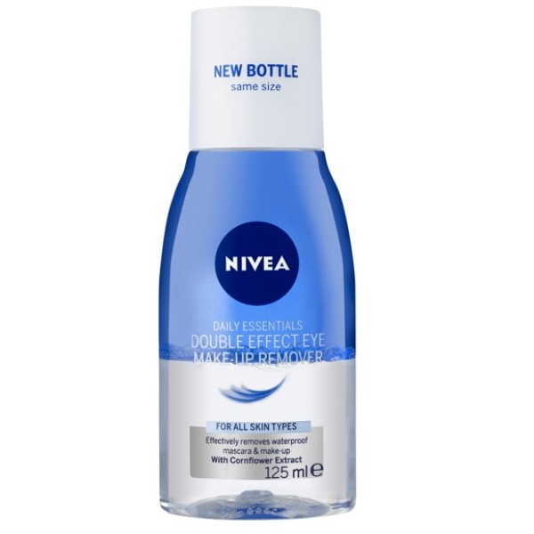 Nivea Daily Eye Make Up Remover 125 Ml. NIVEA Double Effect Eye Make-up Remover is the perfect at home or on the go eye make-up remover. NIVEA® Daily essentials Double Effective Eye Make-up Remover with a two-phase extra strength formula: The oil phase effectively removes even waterproof mascara and eye-make-up.